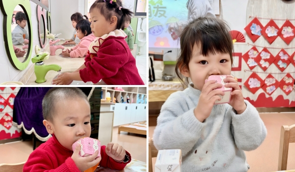 游戏过后,幼儿园为萌宝们准备了营养又美味的加餐。松软香甜的小馒头,醇厚丝滑的酸奶,让萌宝们的小能量满满回归。在老师的引导下,萌宝们学习排队取餐、安静就坐,尝试着自己动手拿点心,体验着自我服务的乐趣。家长们看着萌宝们独立的模样,脸上露出了欣慰的笑容。
