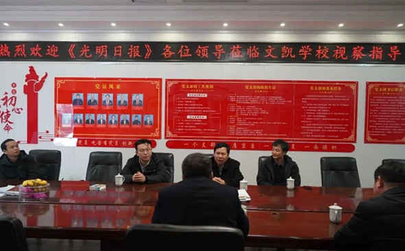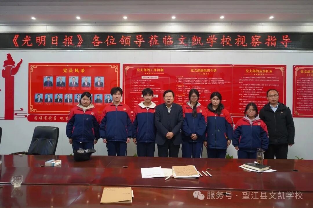 3月9日,光明日报《教育家》杂志社副总裁王俊文一行莅临望江县文凯学校,就学校党建、文化育人及特色办学等工作进行专题调研。县教育局党委委员、副局长王芳,融媒体中心党组副书记江兴旺陪同调研。文凯学校党支部书记、董事长汪毅,执行校长余海海等热情接待了调研组一行。