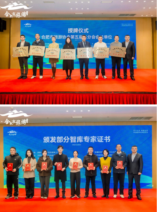 随后,大会举行授牌、揭牌及证书颁发仪式。卢尚勇为第五届理事会会长授牌,张剑依次为副会长代表、各分会会长代表授牌;柴先利为新成立的营销与传播分会、科创科普研学分会揭牌,标志着合肥文旅在品牌推广、科创融合领域的布局进一步深化。此外,张剑还为第五届协会部分智库专家颁发证书,依托专家智力资源为合肥文旅高质量发展提供支撑。