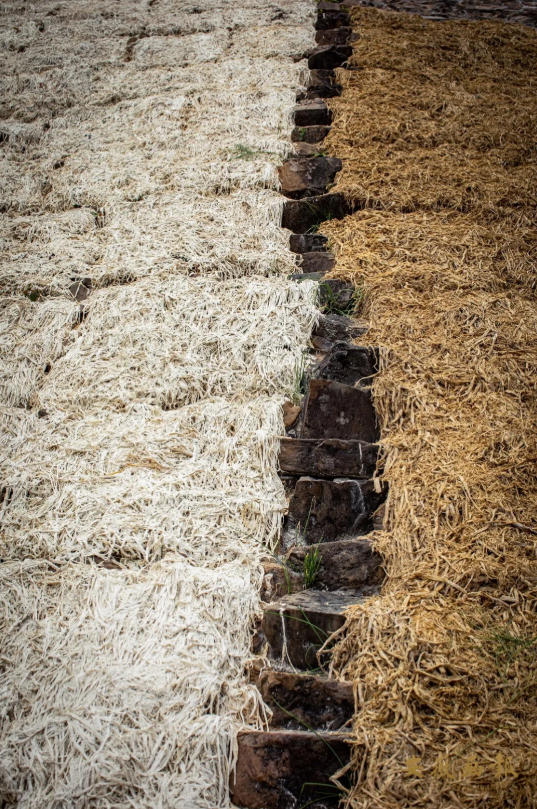 一张上好的宣纸从青檀树皮、沙田稻草变成韧性十足的纸张,需要经过浸泡、清洗、蒸煮、摊晒、捞纸、晾晒等108道工序,历时一年多方成。古法制作宣纸使用草木灰或石灰,对青檀皮中的纤维进行提炼,但树皮中纤维素含量较少,且夹杂着色素、果胶、多糖、半纤维素等杂质,处理起来格外困难,需经多次蒸煮。第一次蒸煮,经石滩露炼后,得到的并非理想的纸料,无法直接使用,只得再次蒸煮;再经石滩露炼;如此反复三次,日晒雨淋,层层打磨,才能从树皮中精准提炼出纯净纤维,制成优质纸浆。
