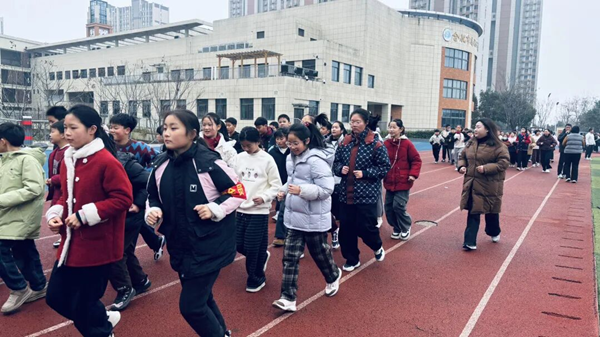 活动中,同学们以班级为单位,在班主任老师和体育组老师的带领下,沿着精心设计的跑步路线,迈着整齐有力的步伐,精神饱满地向前奔跑。一个个班级队伍有序行进,同学们脸上洋溢着笑容,展现出团结协作、奋发向上的青春朝气,为冬日校园注入了蓬勃的欢动气息。