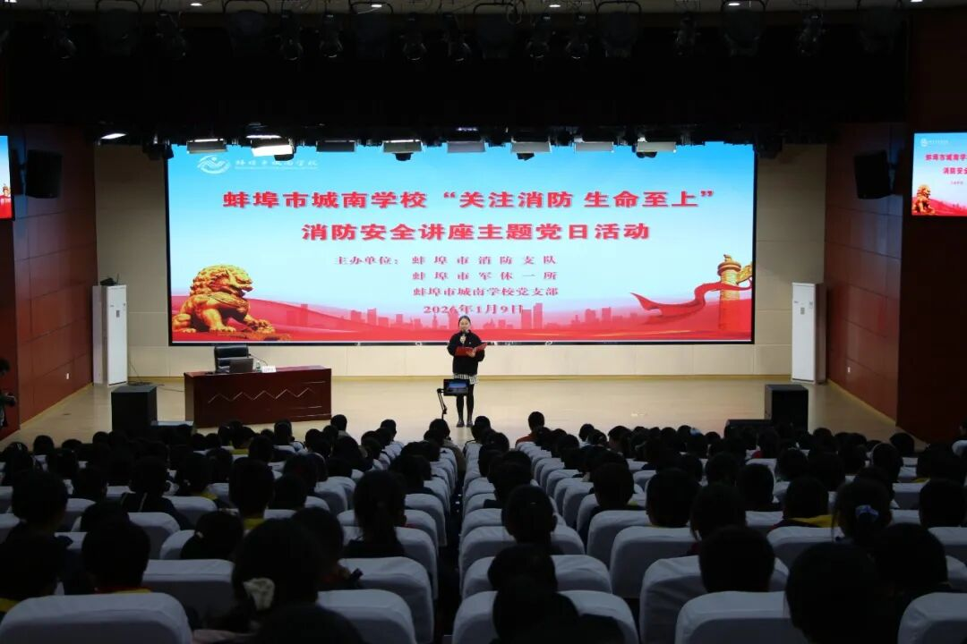 “火魔无情,防患于未然才是关键!”回望近期发生的多起居家和校园失火的案例,无一不敲响着消防安全的警钟。为给校园安全装上“防火墙”,让消防安全知识真正走进师生心里,2026年1月9日下午,蚌埠市城南学校携手蚌埠市消防支队、蚌埠市退役军人事务局,开展了以“关注消防 生命至上”为主题的消防安全讲座活动暨主题党日活动。消防员们、党员教师们和四年级的学生们齐聚一堂,沉浸式解锁消防安全新知识!