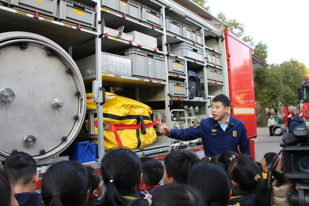 讲座结束后,学生们来到室外实地参观消防车并聆听户外消防知识实操讲解。消防员同志现场演示了灭火器、消防水带等消防器材的正确使用方法,还邀请学生代表乘坐登高平台消防车,让同学们在亲身体验中掌握实用的消防技能,将消防安全知识真正转化为实际操作能力。