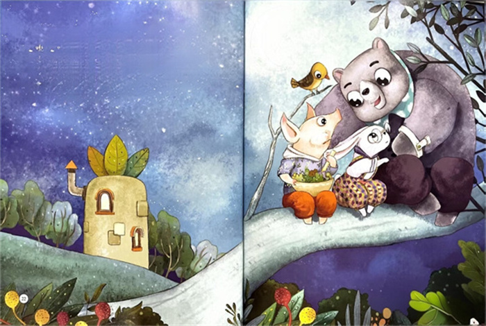 当小小鸟、灰灰熊和噜噜猪把自家蔬菜送给兔子先生时,善意的种子已经埋下;当大家一起在菜园里挥汗劳作,收获的不仅是饱满的蔬果,更是彼此的信任与友谊。最动人的是结尾,大家围坐分享蔬菜沙拉的画面,让孩子明白:好东西要一起分享,美好的生活要靠共同努力来创造。