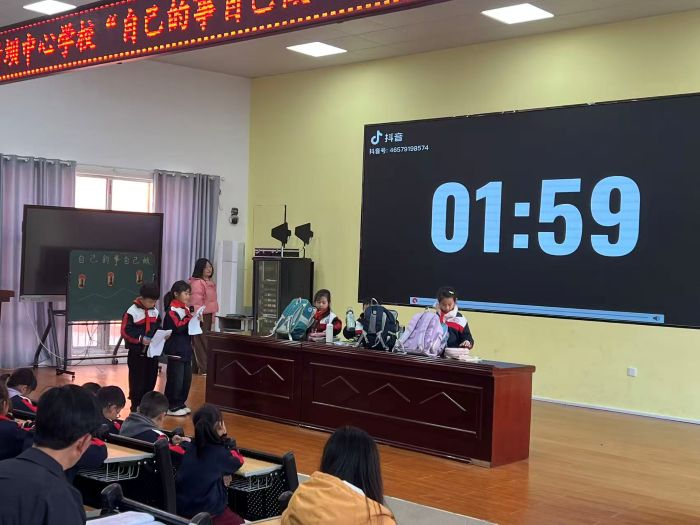在整理书包竞赛现场,大屏幕上的计时器不断跳动,参赛队员们争分夺秒地整理书本、文具,台下队员们齐声加油,氛围热烈。系红领巾比赛中,小队员们动作娴熟,稚嫩的脸上写满认真,用标准的动作展现着日常养成的自主能力。活动中还穿插播放了队员做家务的视频,“家务小达人”的分享更是让大家感受到自主做事带来的成就感。最后,大队辅导员进行总结讲话并带领队员呼号,为本次中队会画上圆满句号。