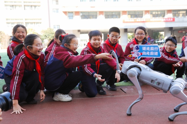 “互动・未来伙伴篇”则让科技变得可触可感。操场上,“未来伙伴” 智能机器狗互动展热闹非凡,科大讯飞机器人等先进 AI设备逐一亮相,学生们近距离观察、亲手操作,在趣味互动中感受机器人技术的飞速发展与无限可能。