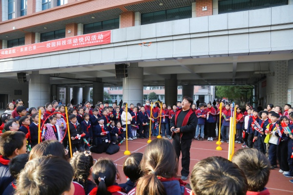 “创造・未来空天篇”将活动推向高潮,将理论知识转化为实践成果。操场上,无人机飞行秀惊艳亮相,一架架无人机在孩子们的精准操控下,完成一系列灵动酷炫的动态表演,时而编队飞行,时而变换造型,同时老师现场讲解无人机的工作原理及发展前景,让学生们领略到科技的精准与神奇。另一边,“飞天梦—航天航空模型制作与试飞” 活动热火朝天,火箭模型载着龙的彩旗升空,在蓝天中留下一道绚丽而独特的轨迹,学生们亲手制作的水火箭成功升空,操场上响起阵阵欢呼,孩子们在实践中体验到空气动力学与工程设计的乐趣,更感受到创造与飞翔带来的成就感。