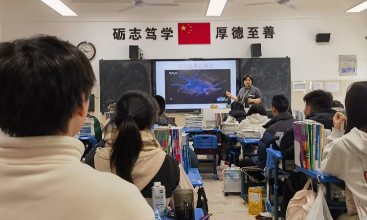 学校教务处联合高一年级部,积极推动“科晚盛典进课堂”,鼓励物理、化学、生物等理科教师结合各自学科教学进度和知识点,灵活选取“科晚”中的相关案例、实验或人物故事,将其有机融入日常课堂教学。高一老师率先将2025年科学盛典精彩片段拆分为12个3~8分钟微视频,对应物理、化学、生物教材中的“超重与失重”“消防材料及其应用”“新型电池”等重难点。物理教师陆茹把“太空展示水球实验”片段插入《超重与失重》一节,让学生通过了解航天员实验数据,完成课堂教学。化学教师王婷通过播放科学盛典视频片段,带领学生学习消防材料的知识。这些直观视频比任何说教都更能让学生感受国家科技实力。这种融入不仅丰富了教学内容,更使抽象的科学原理与国家生动的科技实践紧密相连,让课堂焕发新的活力。