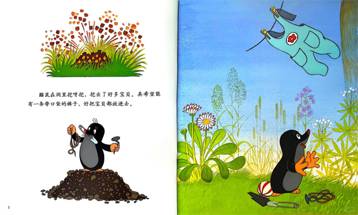 鼹鼠在洞里挖呀挖,挖出了好多宝贝。真希望能有一条带口袋的裤子,好把宝贝都放进去。