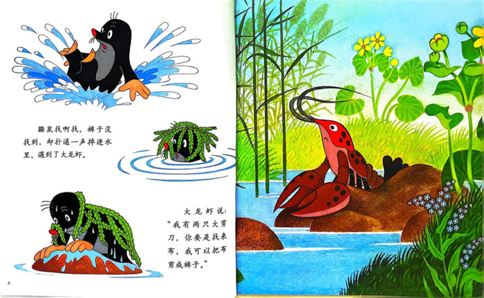 鼹鼠找啊找,裤子没找到,却扑通一声掉进水里,遇到了大龙虾。