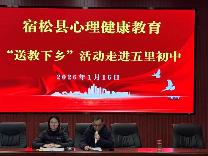 为加强校园心理健康教育,呵护青少年身心健康成长,2026年1月16日下午4:40,宿松县心理健康教育“送教下乡”活动在五里初中新综合楼报告厅顺利开展。