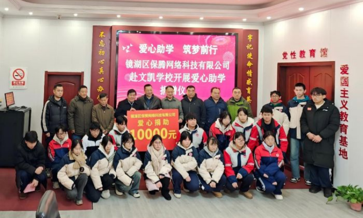1月21日,芜湖市镜湖区保腾网络科技有限公司总经理吴英华一行来到文凯学校,在学校党员活动室举行爱心助学捐赠仪式,以实际行动助力教育公益,传递企业社会责任。文凯学校党支部书记、董事长汪毅,执行校长余海海以及部分受资助学生共同参加仪式。