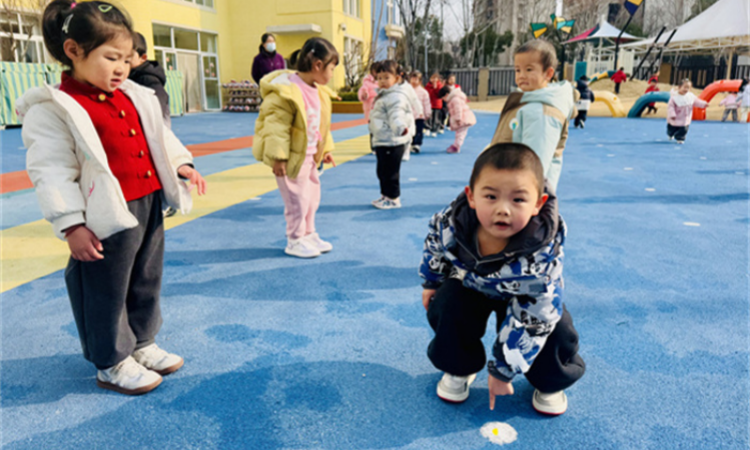 户外散步时,队伍突然在操场边停住了。几个孩子蹲在地上,伸着手指戳向地面的白色小圆点。