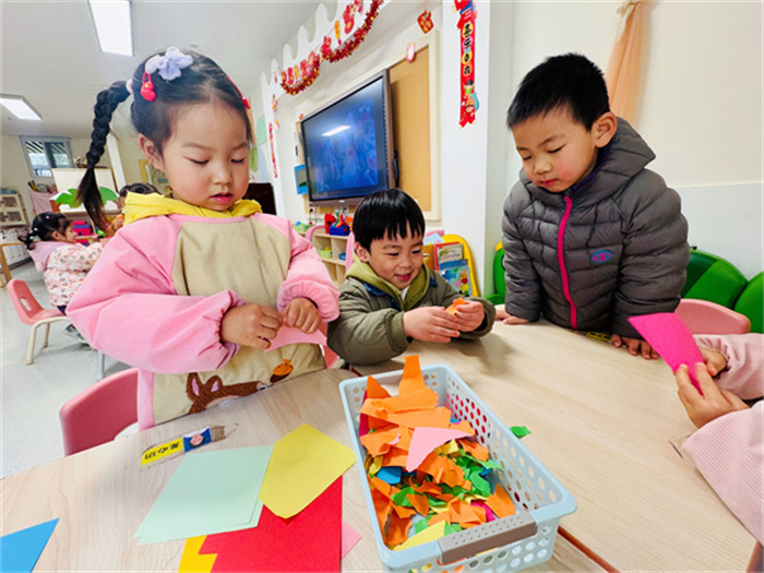 让点点 “藏” 起来:新年的氛围扑面而来,宝贝们化身小小创作家,将彩纸撕成五颜六色的小纸片,再用胶棒小心翼翼地粘贴在底板上。一片片彩纸错落叠放,瞬间绽放出绚烂的 “烟花。”