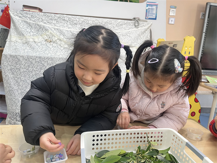孩子们开始寻找制作冰花的材料,原来干花、树叶、鲜花、小玩具、彩球等,都可以成为我们制作冰花的材料。