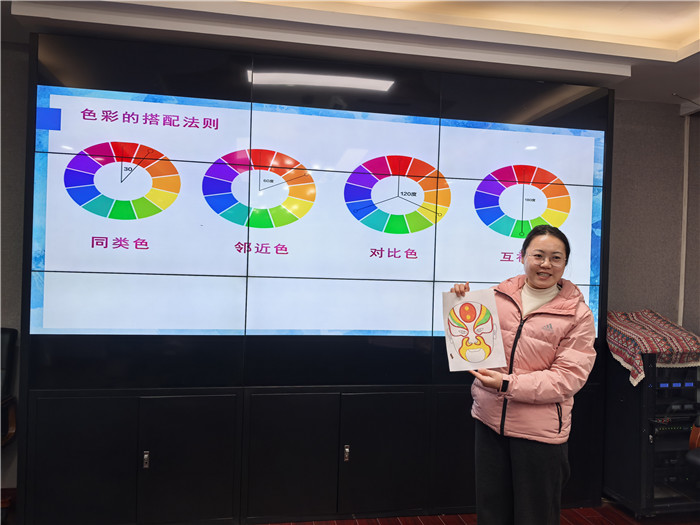 在实操环节,教师们将色彩理论融入作品优化,用高对比色调绘制花瓶,通过鲜明的色彩反差,帮助小班幼儿分辨易混淆色;用明亮暖色调创作抽象画,引导中班幼儿建立色彩与物体的关联;用冷暖色彩搭配绘制京剧脸谱,启发大班幼儿用色彩表达角色情绪与性格特点。在实践中,教师们直观掌握了各年龄段幼儿的色彩认知特点,为后续精准教学积累了经验。