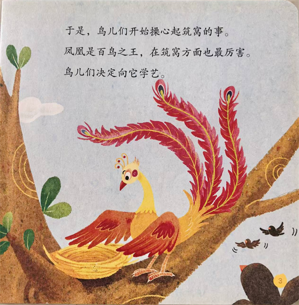 于是,鸟儿们开始操心起筑窝的事。凤凰是百鸟之王,在筑窝方面也最厉害。鸟儿们决定向它学艺。