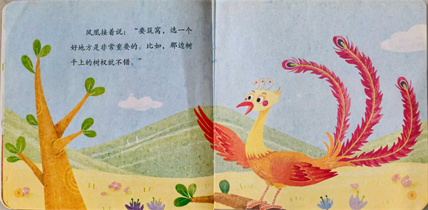 在鲜花盛开的树林里,凤凰昂首站在树枝上。鸟儿们围绕在周围听课。凤凰说:“学本领要有耐心,没有耐心,那可什么都学不成。”