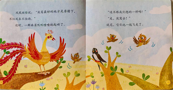 凤凰继续说:“筑窝最好的地方是房檐下,不怕风来不怕雨。”这时,一群麻雀叽叽喳喳地起哄了。“这不跟我们想的一样吗?”“走,筑窝去!”说完,它们也一起飞走了。