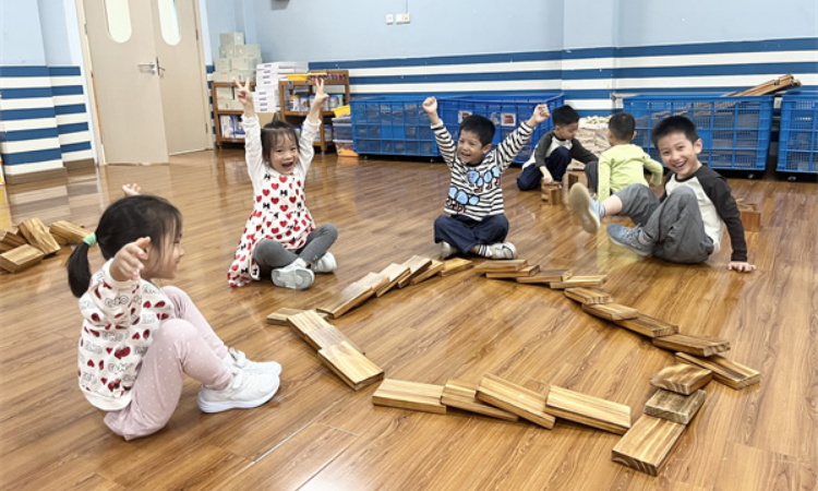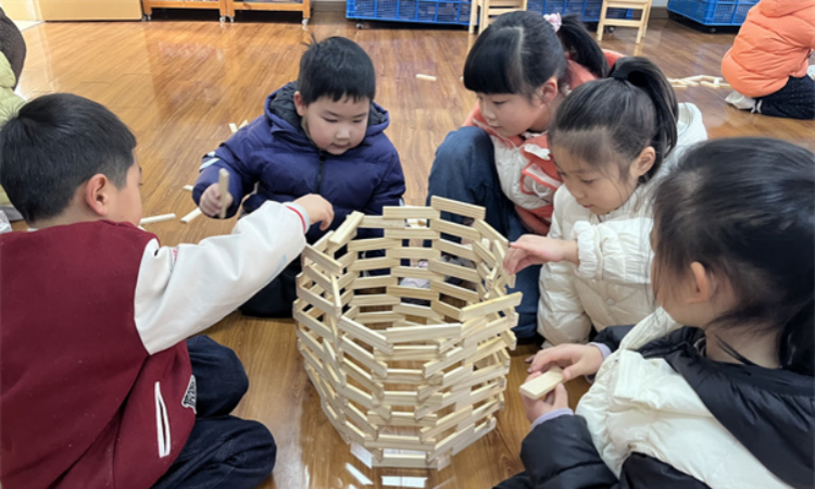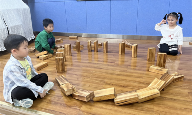 随着游戏的推进,孩子们在积累了一定经验之后开始尝试更具挑战性的玩法,他们不满足于直线摆放的玩法,创想出许多花样的摆放方式。