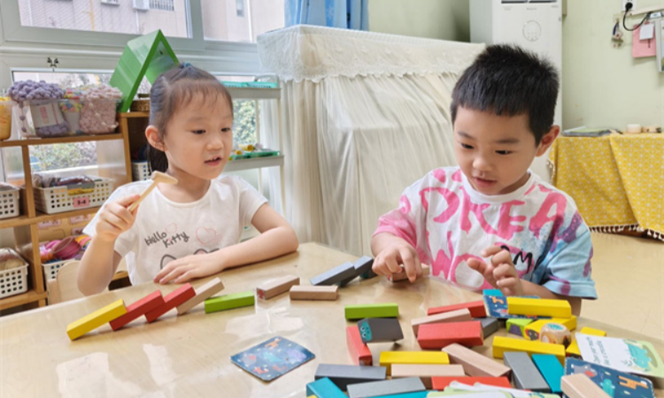 一段时间的游戏后,有的孩子开始尝试向上搭建立体多米诺,引发了其他同伴的共同尝试、体验。