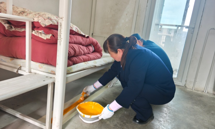 此次专项行动以“规范细节、优化环境、服务育人”为目标,针对以往学生床下鞋子摆放杂乱、空间利用不合理等问题,项目部经过多次现场勘查与方案研讨,制定了统一的划线标准。教官与安保人员分工协作,严格按照宿舍床位布局,用耐磨环保漆在床下地面精准划定物品摆放区域,明确鞋子摆放位置与朝向,确保每间宿舍的划线清晰统一、整齐规范。