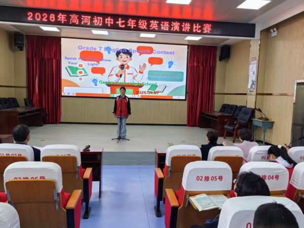 为丰富校园文化生活,营造浓厚的英语学习氛围,展现七年级学子积极向上的精神风貌,4月7日,怀宁县高河初中七年级英语演讲比赛在学校报告厅顺利举办。本次比赛以“阳光向上、健康成长”为核心导向,同学们围绕青春梦想、校园生活、环境保护、中外文化、我的榜样等主题自选内容,用流利的英语传递少年心声,以自信的风采绽放青春光芒。