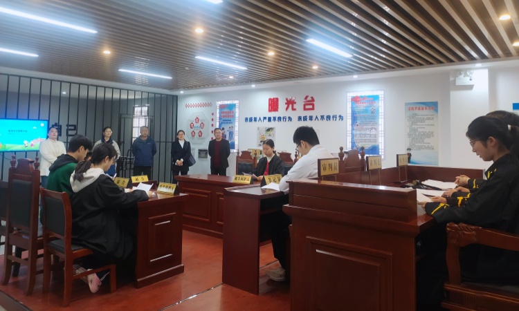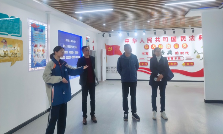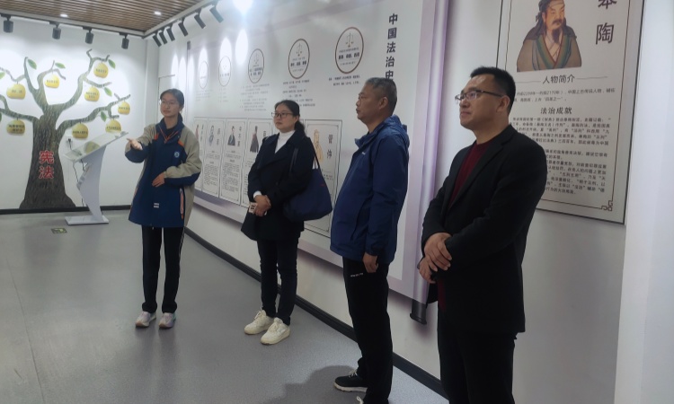 调研组一行首先走进学校法治教育基地,实地调研学校法治育人阵地建设与使用情况。调研过程中,调研组认真聆听讲解员鲁奕玮同学对基地各展区法治知识、案例故事的细致解说,近距离感受学校的法治教育氛围;随后现场观看了学生自编自演的模拟法庭,同学们以规范的流程、真切的演绎,生动还原庭审现场,将法治理念融入情景实践,充分展现了学校法治教育的扎实成效和青少年良好的法治素养,调研组对这一创新的育人形式给予高度认可。