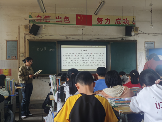 4月17日,宿松县柳溪初级中学校成功举办了一场精彩纷呈的语文公开课。此次公开课由余明霞老师主讲,学校全体语文教师及部分其他学科教师参与了观摩。在701班的语文课堂上,余明霞老师老师开启了一场别开生面的文言文之旅,带领学生走进北宋时期,与卖油翁和陈尧咨展开了一场关于“德才兼备”的较量。随后,学生们分角色演绎文中对话。教室舞台虽小,却成了同学们展现自身才华的天地。他们将陈尧咨的自矜与忿然、卖油翁的沉稳和谦逊演绎得淋漓尽致,仿佛让古人从书中走了出来,加深了同学们对人物的理解。