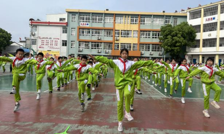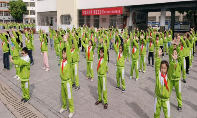 随着音乐响起,同学们迅速进入状态。伸展、扩胸、踢腿、跳跃……每一个动作都标准规范、整齐划一;每一次抬手、每一次转身都充满力量、节奏明快 。鲜艳的红领巾在阳光下闪耀,统一的校服汇成流动的色彩,整个操场宛如一片活力四射的红色海洋 。
