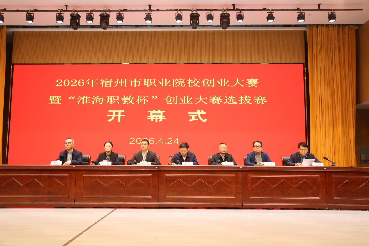 4月24日,2026年宿州市职业院校创业大赛暨“淮海职教杯”创业大赛市级选拔赛在宿州应用技术学校顺利开幕。市、区教体局领导及各参赛院校学生和辅导教师出席,活动由副校长王仲锋主持。