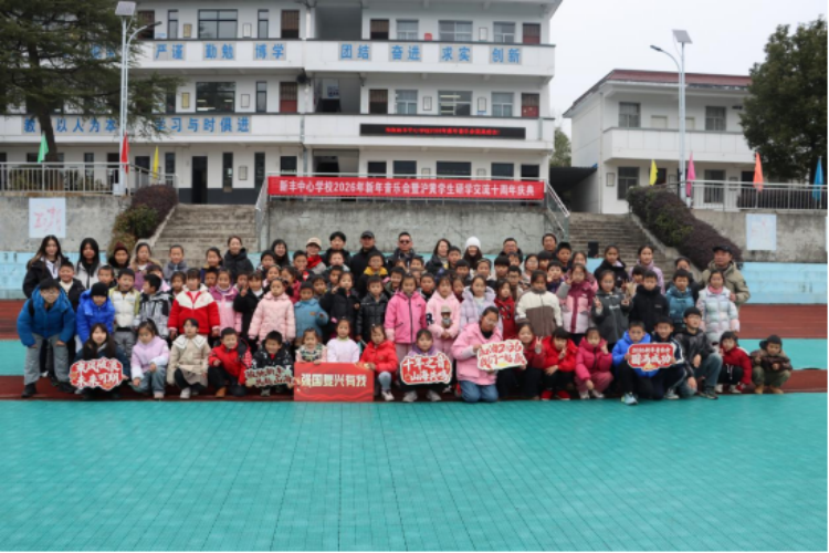 十年前,一名叫王道恒的上海男孩跟随母亲首次来到新丰中心学校参与研学交流,像一颗轻落泥土的种子,将“交流”与“音乐”的希望带进了这座乡村学校。当时,全校仅有的乐器是几把锈迹斑斑的口风琴。十年间,一次次往来、一份份捐助、一场场教学,让音乐的种子在此生根发芽。