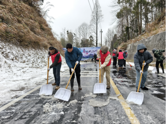 乌石镇以动制“冻”,迅速组织镇村干部奔赴一线。大家携带铁锹、融雪剂等工具,全力清扫罗岭路段积雪。风雪中,干部们挥锹撒盐,重点攻坚弯道、陡坡等险段,同时不断引导车辆安全通行。
