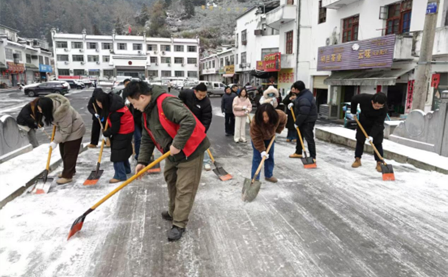 面对突如其来的低温雨雪天气,近日,黟县柯村镇党委、政府迅速响应,以保障群众安全出行为第一要务,由镇村干部、党员、志愿者等组成“破冰先锋队”,在全镇范围内打响了扫雪除冰“攻坚战”。