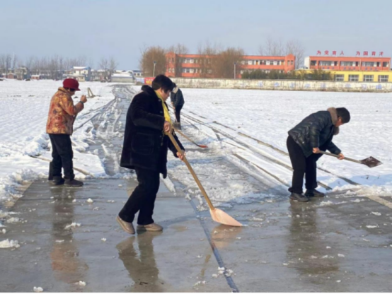 雪停后太阳升起,马店集镇大丁村陈楼自然村村民们便自带铁锹、扫帚等工具,陆续聚集到村口主干道。青壮年村民奋力铲冰扫雪,老年村民负责清理辅路积雪。大家分工明确、默契配合,铁锹铲冰的铿锵声、邻里间的吆喝声交织成冬日里的暖心乐章。