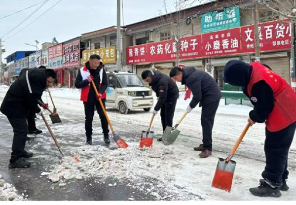 主动除雪显担当,率先垂范守畅通。镇村党员闻令即动、率先垂范,第一时间组建党员攻坚队、志愿服务队,身着红色志愿马甲,携带铁锹、扫帚、除雪铲等工具,奔赴镇域主干道、村口要道、学校周边、农贸市场等重点区域开展除雪作业。大家顶寒风、踏冰雪,采用“机械为主、人工为辅、融雪剂兜底”的方式,对积雪结冰路段进行拉网式清理。从清晨到午后,镇村干部始终坚守一线,挥锹铲冰、抡帚扫雪,不放过任何一处暗冰、任何一个死角,用实干担当为群众开辟出一条条安全畅通的出行路