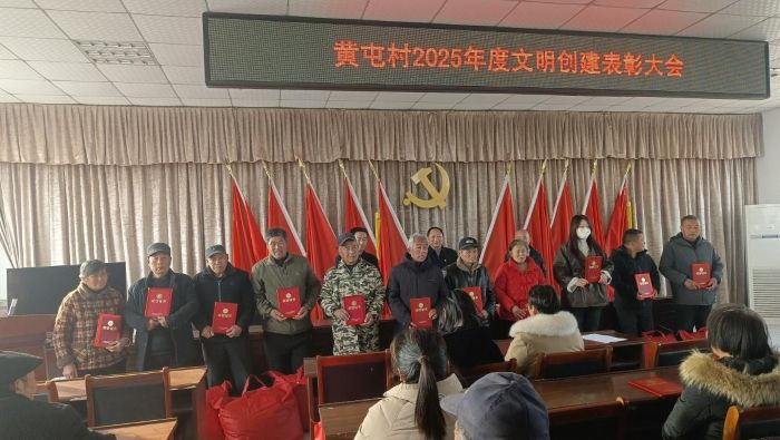 近日,关帝庙镇黄屯村人头攒动、暖意融融,2025年度文明创建表彰大会隆重举行。大会以“表彰先进典型、弘扬文明新风”为主题,通过精心筹备、厚植奖励、直播扩面的多维举措,选树标杆、凝聚共识,为乡村振兴注入强劲的精神动能。