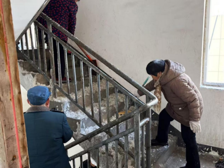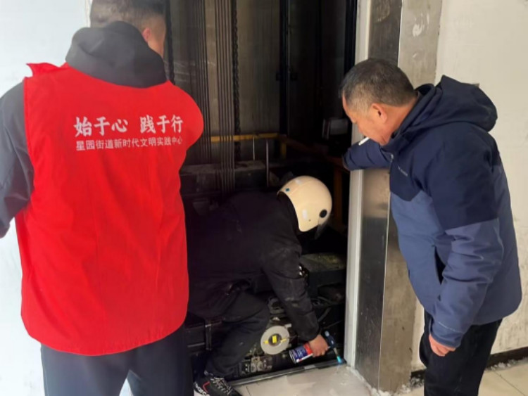 险情发生后,福宁社区与物业在得知消息的第一时间启动应急联动机制,以最快速度响应民生诉求。清晨6时,物业工作人员已集结到位,迅速投入到除险工作中。针对步梯结冰难题,物业人员采用撒盐手工除冰等方式,逐楼层清理碎冰与积水,争分夺秒为业主开辟安全通行通道。与此同时,面对电梯进水结冰的复杂故障,物业联系电梯维保人员,结合现场实际情况,对电梯轿厢底部、导轨等关键结冰部件进行精准加热、排水除湿。经过数小时的紧张抢修,目前其中一部电梯已成功恢复正常运行,有效缓解了业主出行压力,保障了基本通行需求。