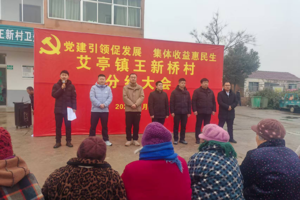 (图为艾亭镇政府镇长刘通一行参加王新桥村的村集体收益分红大会)