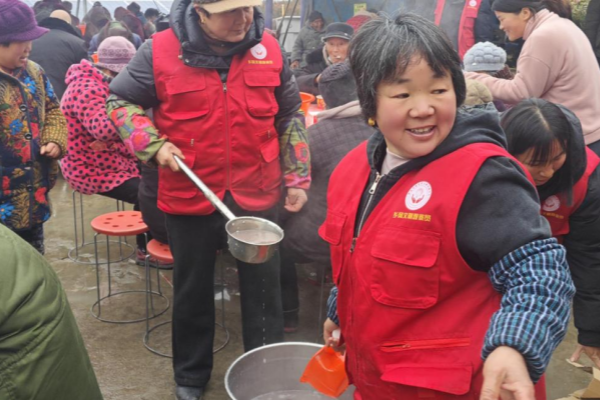 艾亭镇王新桥村在这次主题活动准备的是为全村375名80岁以上的老人分红、分粥、品尝大锅饭、免费体检、送春联、照相等活动。早上6点艾亭镇王新桥村活动现场,近30名以党员干部、村民组长、公益岗位为主的志愿者身穿红色马甲,早早来到活动现场,熬粥、洗菜、切菜、搬桌子布置会场,为今天的村集体分红和施粥忙碌着。志愿者一边劳作一边分享着生活趣事,欢声笑语填满了整个村部。