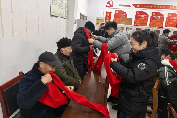 (图为桃花店村支部书记马瑞为老党员佩戴红围脖)