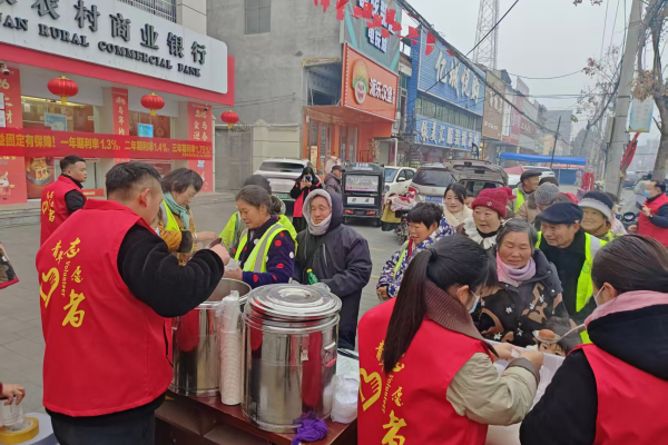(图为艾亭镇王新桥村志愿者为80岁以上老人分粥)