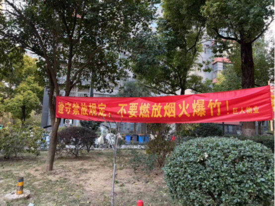 在宣传形式上,社区实现场景化覆盖:线下,工作人员身着红色志愿马甲,在巨人印象法治广场向居民面对面发放《致全县广大群众的一封信》,用通俗语言解读禁燃时段、范围及违规责任,针对老年居民重点讲解燃放烟花爆竹的安全隐患;同时在谷水社区辖区内四个商业小区大门口设置喇叭循环播放禁燃禁放内容,让宣传声音直达居民耳畔;巨人物业则在小区内悬挂“遵守禁放规定,不要燃放烟火爆竹”的红色横幅,让禁燃提醒随处可见。线上,社区通过居民微信群、朋友圈转发禁燃政策文件与宣传视频,物业管家也在各小区业主群推送温馨提示,形成“广场宣传+小区布展+喇叭播报+线上推送”的立体宣传网络。