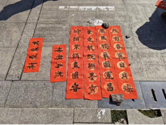 书法班的学员们个个精神饱满,挥毫泼墨,精心准备了一系列春联和福字,现场即兴书写,满足村民个性化需求。一幅幅寓意吉祥、字体遒劲的春联以及一个个红彤彤、满载祝福的福字,很快便铺满了整个广场。
