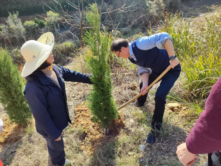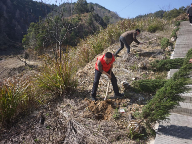 活动现场,暖意融融。镇村干部身着志愿者服装,精神饱满,早早携带铁锹、锄头、水桶等工具抵达现场,迅速投入到植树劳动中。大家分工明确、配合默契,挖坑、扶苗、填土、踩实、浇水,每一个环节都认真细致、一丝不苟。在此起彼伏的欢声笑语间,一棵棵新栽的树苗挺拔而立,在春风中焕发勃勃生机,为肃穆的公墓增添了一抹灵动的绿意,也为深渡的生态画卷勾勒出鲜明的绿色线条。
