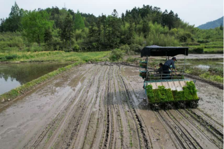 插秧现场,高速乘坐式插秧机在田间来回穿梭,机械化插秧株距均匀、深浅一致,作业效率是人工插秧的数十倍。既能保证头季水稻稳产,又为再生季芽萌发留足生长空间。