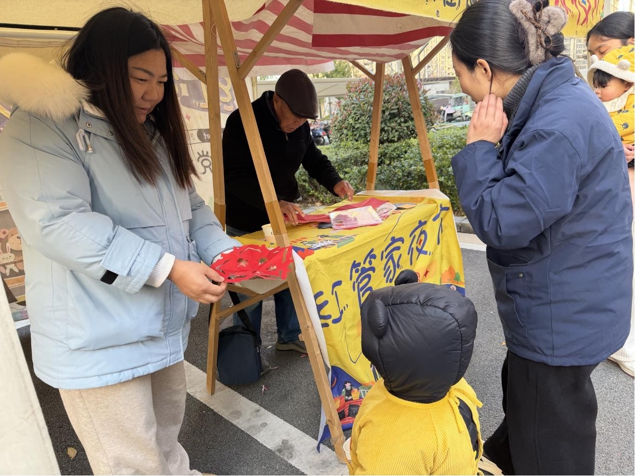 互动体验区域成为居民们聊天互动的欢乐天地。套圈摊位前,居民们排着整齐的队伍,手持套圈瞄准目标,凝神聚力抛出,套中蔬菜的欢呼声此起彼伏;创意涂鸦书签区,社区安全宣传员宣讲冬季防火防灾安全注意事项,孩子们发挥想象力,用彩笔在书签上绘制灭火器、救援消防车及冬季安全逃生等画面,一个个色彩鲜艳、充满童趣的书签新鲜出炉,不仅锻炼了动手能力,更收获了满满的成就感。最具年味儿的当属民俗剪纸区,民间艺人现场传授剪纸技巧,居民们围在一起,跟着师傅折叠、裁剪,不一会儿,一个个栩栩如生的小马剪纸、寓意吉祥的窗花就呈现在眼前,大家互相展示成果,分享剪纸的乐趣,浓浓的年味儿在指尖流转。