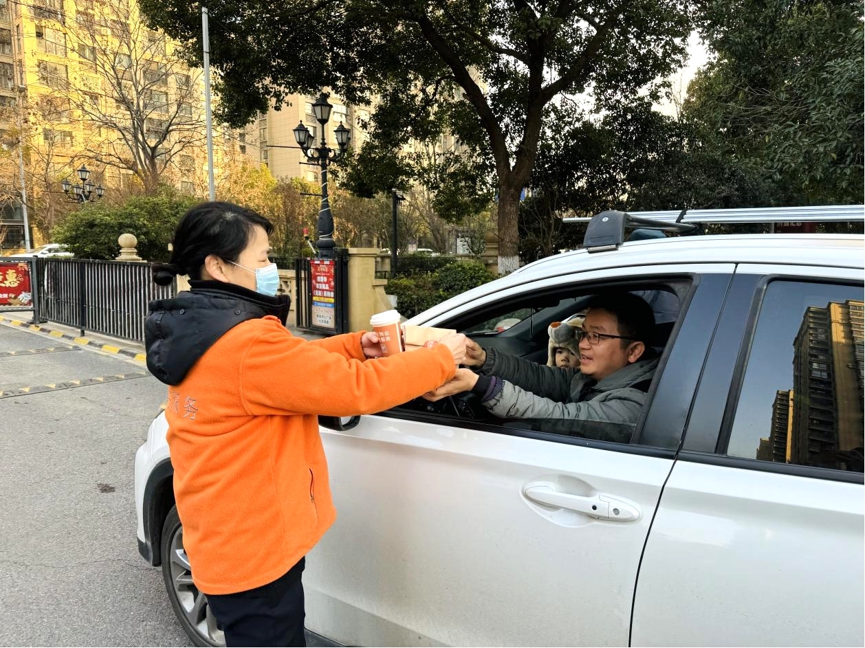 图为工作人员正将暖心早餐送至居民手中