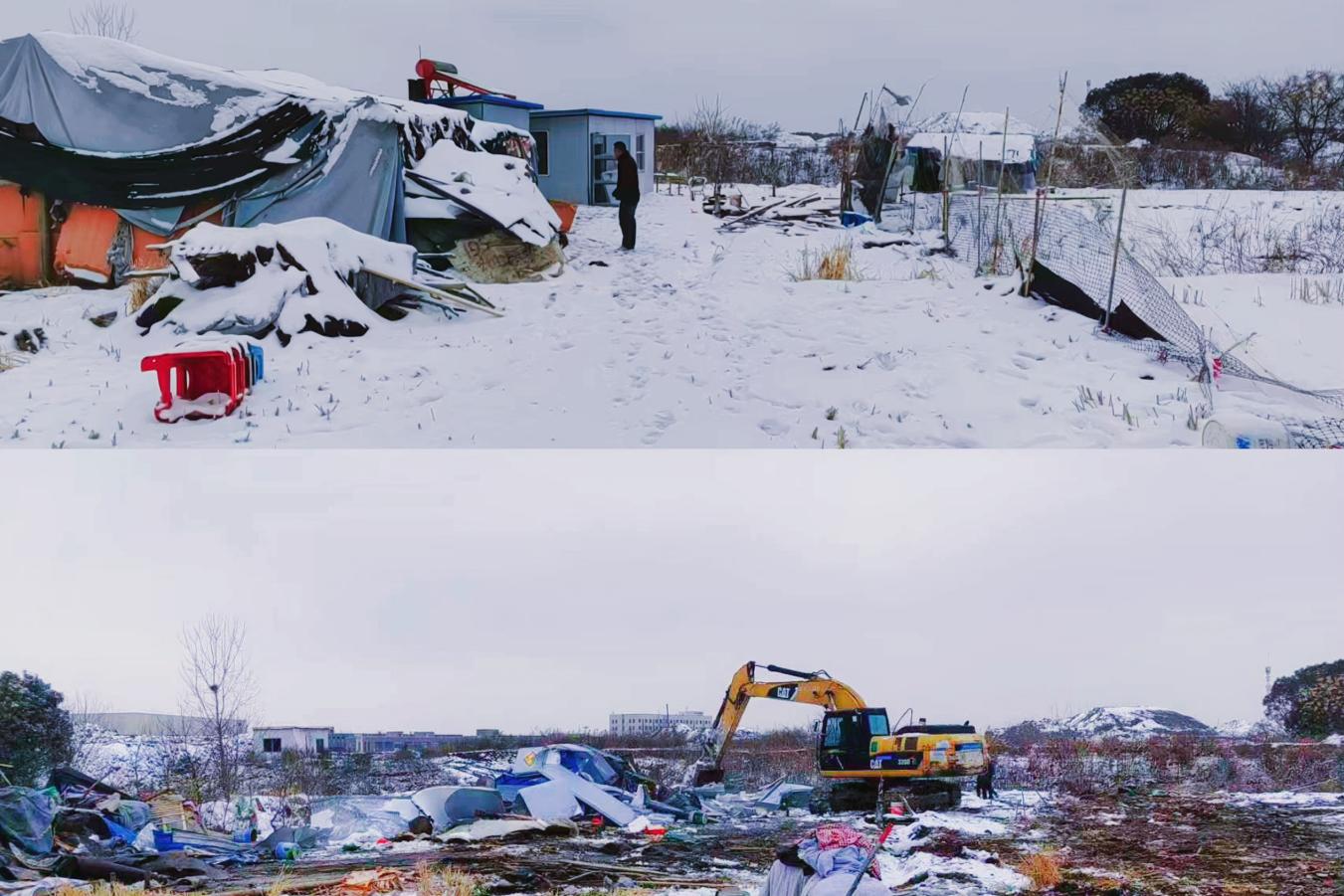 1月20日,尽管天降大雪,为不影响整体施工进度,社区在下午雪停后,按计划组织力量进场作业。工作人员在现场有序开展搬运物品、清理场地等工作。经过约4小时的连续作业,随着最后一处违建被顺利拆除,社区高标准农田建设又迈出了坚实的一步。