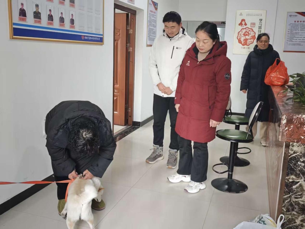1月21日下午,社区接到居民反映,在广场上发现一只宠物狗无人认领,希望能够找到狗的主人。社区立即启动联动响应预案:线上,“铁娘子”志愿者将小狗的照片、特征及走失地点发布到社区业主微信群和抖音平台,发动大家“随手拍、及时报”;线下,志愿者们给小狗买来狗粮和牵狗绳,并细心给小狗搭建了狗窝,联合小区物业,将小狗放在温暖安全的物业值班室暂时安顿下来。同时,调取监控,进一步扩大搜寻范围,并联合其他社区,共同发布认领宠物犬的公告,以期尽快找到狗的主人。